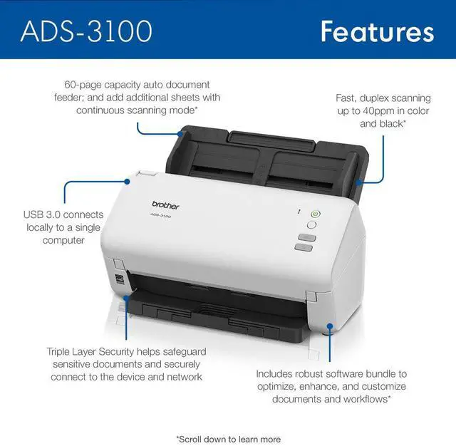 It is compatible with Windows, Mac, and Linux operating systems and includes TWAIN, WIA for PC, ICA for MAC, and SANE drivers, ensuring seamless integration into your existing workflow. The intuitive user interface of the Brother ADS-3100 makes scanning simple and straightforward. With easy-to-navigate controls, you can manage your scanning tasks with confidence and ease. Advanced document customization features like auto deskew, auto rotation, blank page skip, and background color removal ensure that your scans are of the highest quality. Security is paramount, and the ADS-3100 provides triple-layer security to protect sensitive documents and ensure secure connections to both the device and network.