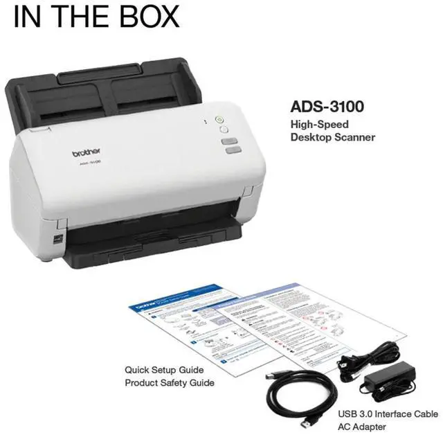 The ADS-3100's space-saving design is a testament to its user-friendly nature, offering a compact footprint that fits seamlessly into any small business or home office environment. Despite its modest size, this scanner does not compromise on performance, boasting a robust software bundle valued at over $250. This suite of applications includes Brother iPrint & Scan, Scan Essentials Lite, Image Folio Processing Software, Kofax PaperPort 14SE, Kofax Power PDF Standard V3, Presto! BizCard, and BR-Receipts, all designed to optimize, enhance, and customize your documents and workflows.