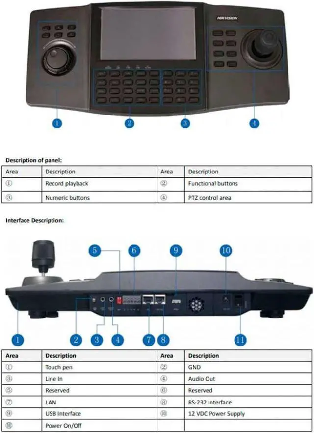The DS-1100KI is a control panel with a 7-inch touchscreen display, function keys and a 4D joystick.