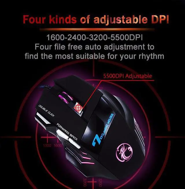 DPI1000/1600/2400/3200/5500,Polling Rate:500Hz,DPI and Polling Rate settings are closely related to the game performance,high polling rate can possible to reduce the likelihood of your movements being misinterpreted.