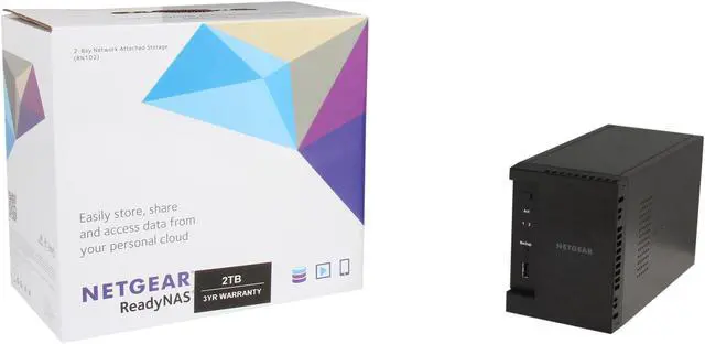 The NETGEAR ReadyNAS 102 is a 2-bay, network-connected NAS storage device designed and optimized for home users and small businesses. Powered by 1.2GHz Marvell Armada 370 processor and 512MB RAM, this system offers you a fast and easy way to centralize, access, and share your digital world. Its revolutionary ReadyNAS operating system redefines the way you use and manage the NAS device. Enjoy simple cloud-based setup, file access and management with ReadyCLOUD. Sync files across your digital ecosystem with ReadyDROP. And extend the NAS functionality with an expanding library of software add-ons. Also rest assured knowing that stored data is well protected with RAID configuration, and secured from any threat with unlimited snapshots along with real-time anti-virus and native encryption. The built in USB ports make storage expansion and file share a breeze.