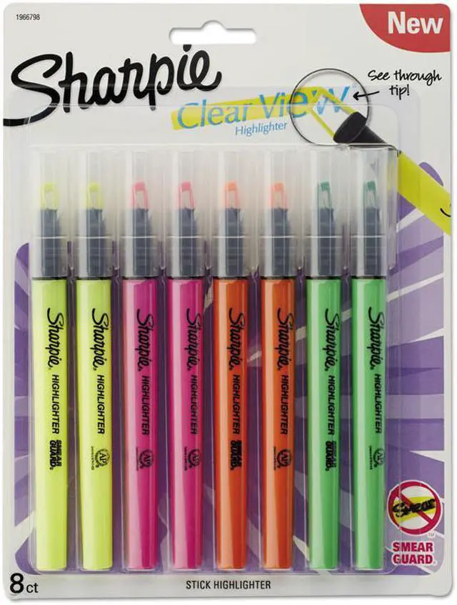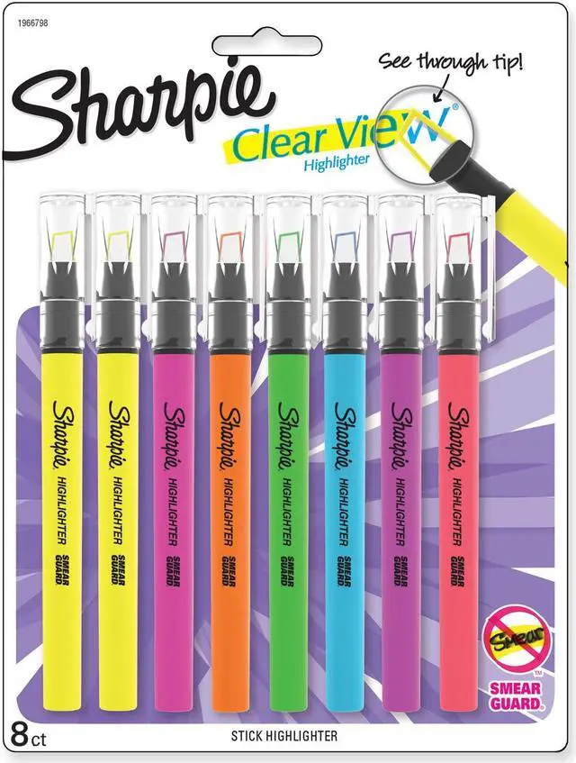 Always know when to stop with the Sharpie Clear View highlighter! A see-through tip allows you to keep your eyes locked on the page and precisely highlight. The blade-style tip lets you switch between both wide and narrow lines. Finally, ultra-vivid ink resists the smearing of many pen and marker inks.