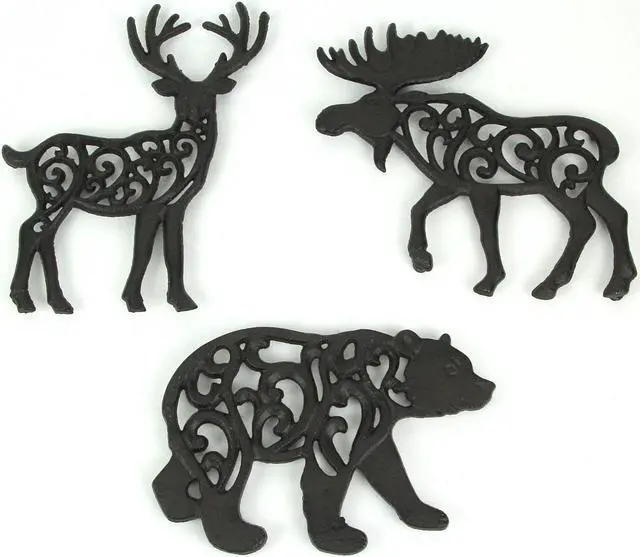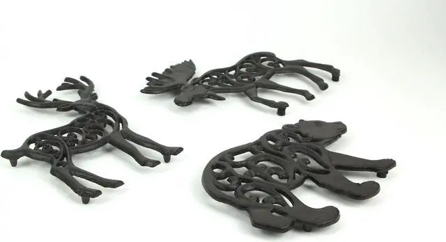 Introduce a touch of wilderness to your kitchen or cabin with this charming three-piece set of cast iron trivets, adorned with forest animal designs. Crafted with intricate openwork detailing, these trivets feature a dark brown enamel finish, adding a rustic allure to your space. The set comprises a bear, a deer, and a moose, celebrating the beauty of the wild. Not just functional, these trivets serve as versatile decorative accents, perfect for adorning walls or shelves when they're not safeguarding your surfaces from hot dishes. The rubber-tipped feet ensure surface protection, preventing scratches and slips.