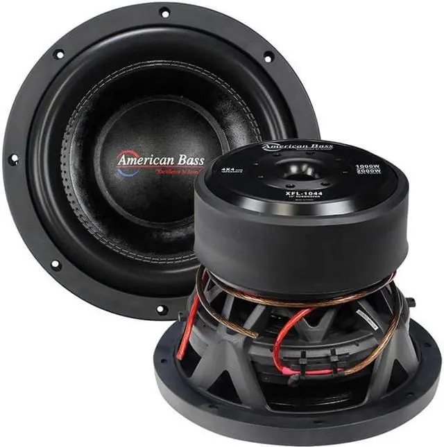 American Bass XFL-1044 2000w 10" Competition Car Subwoofer 3" Voice Coil/200Oz. Impedence: Dual 4-ohm. RDC: 1.7. Levc: 2.194 mH. Fo: 32.4 Hz. Sd: 33.01 msqM. BL: 13.991 TM. Qms: 3.628. Qes: 0.447. Qts: 0.398. n%: 0.478. SPLdB: 87.6. Vas L: 17.6. Cms: 109 uM/N. Mms: 229.2 g. VC: 3 Inch. Mgnt: 220 OZ. Xmax: 19 MM. RMS: 1000W. MAX: 2000W. F.Range: