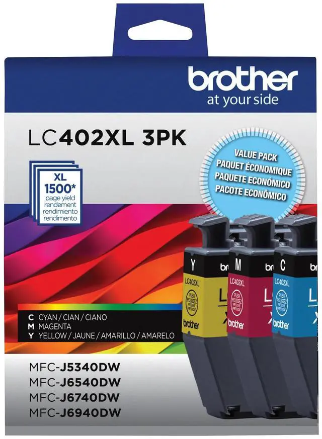 Always trust Brother Genuine ink for superior inkjet print quality and performance you can consistently rely on. These high-yield ink cartridges deliver consistent and professional results. All Brother Genuine ink cartridges are intelligently engineered to work seamlessly with your Brother inkjet printer for consistent, reliable results. Brother Genuine LC402XLBK is for use with Brother Color Inkjet All-In-One printers: MFC-J5340DW, MFC-J6540DW, MFC-J6940DW. Device Types: Inkjet Printer; Color(s): Cyan; Magenta; Yellow; Page-Yield: 1,500; Supply Type: Ink.
