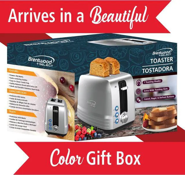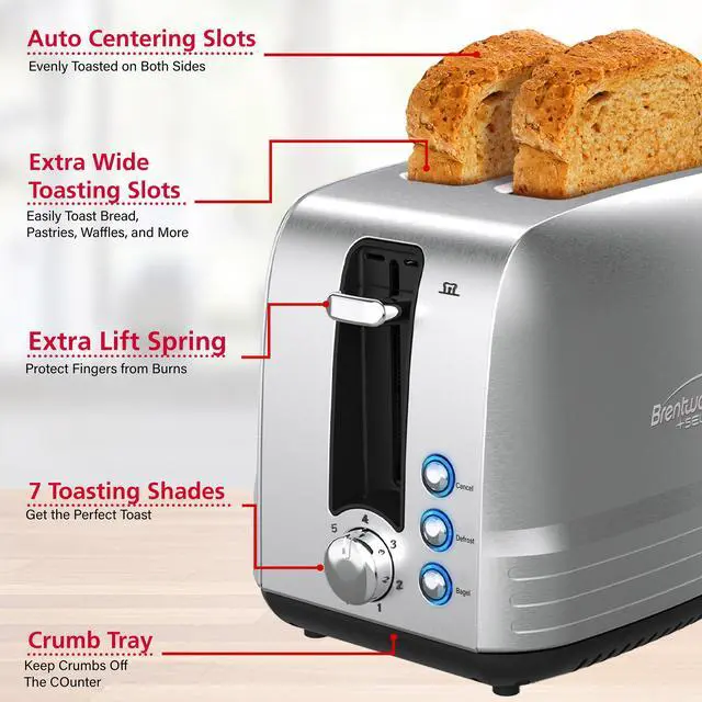 Use the Brentwood Select counter top toaster with extra wide slot to heat toast, bagels, waffles, pastries, and more. Features bagel, defrost, and cancel functions. Have full control with 7 shade settings, removable crumb tray, and extra lift lever. Slots are extra wide for bagels and artisan breads. Beautiful brushed stainless steel body for a sleek look that will go with most kitchen decor.