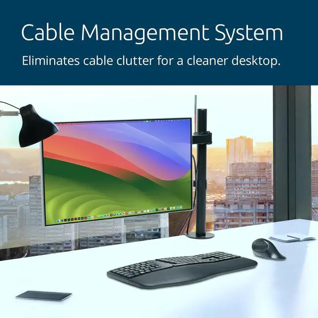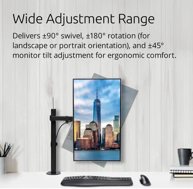 The SmartFit® system makes finding the right height for maximum comfort as easy as 1-2-3. Simply match your hand size to the color on the provided chart, set the height to your color, and you're done. Wide adjustment range delivers ±90° swivel, ±180° rotation (for landscape or portrait orientation), and ±45° monitor tilt adjustment for ergonomic comfort. Cable management system for clutter free desktop Single. Extendable arm allows upto 15-7/10" distance adjustment. VESA. For monitors up to 17.6 lbs (34"). Includes C-clamp and grommet fastener. Black.