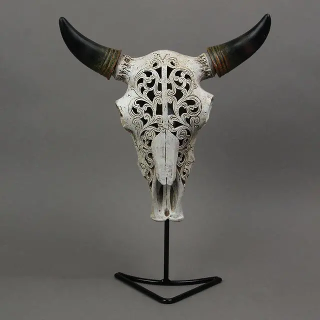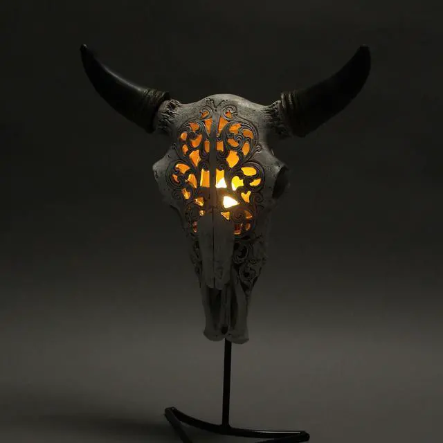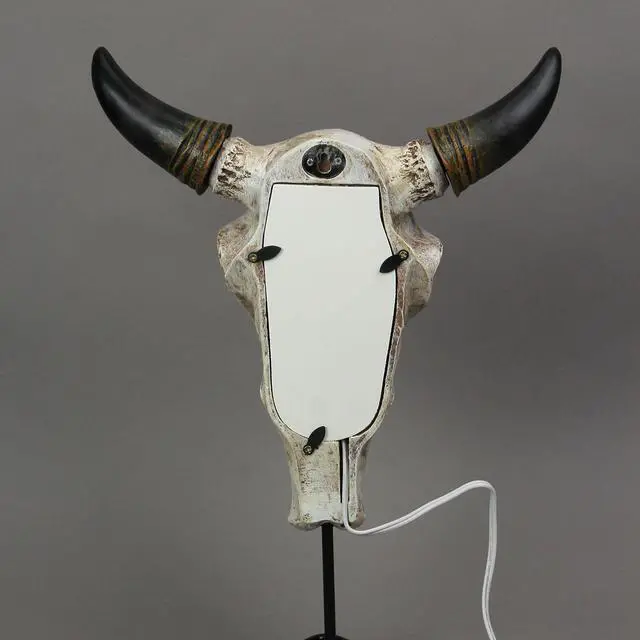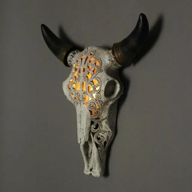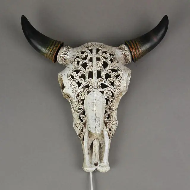 Introducing a stunning Western-inspired bull skull accent lamp that seamlessly merges rustic charm with Southwestern elegance. This versatile piece serves as a captivating wall sconce or a stylish tabletop lamp, effortlessly enhancing any space. The lamp boasts a remarkably lifelike design and features intricate cutout scrollwork, allowing the light to beautifully filter through. Crafted from durable polyresin, it exudes an authentic Texan vibe, making it an ideal addition to bedrooms, living rooms, or offices. As a wall sconce, this lamp stands 11.5 inches high, 11 inches long, and 4.5 inches wide, effortlessly adorning your wall with its unique charm.