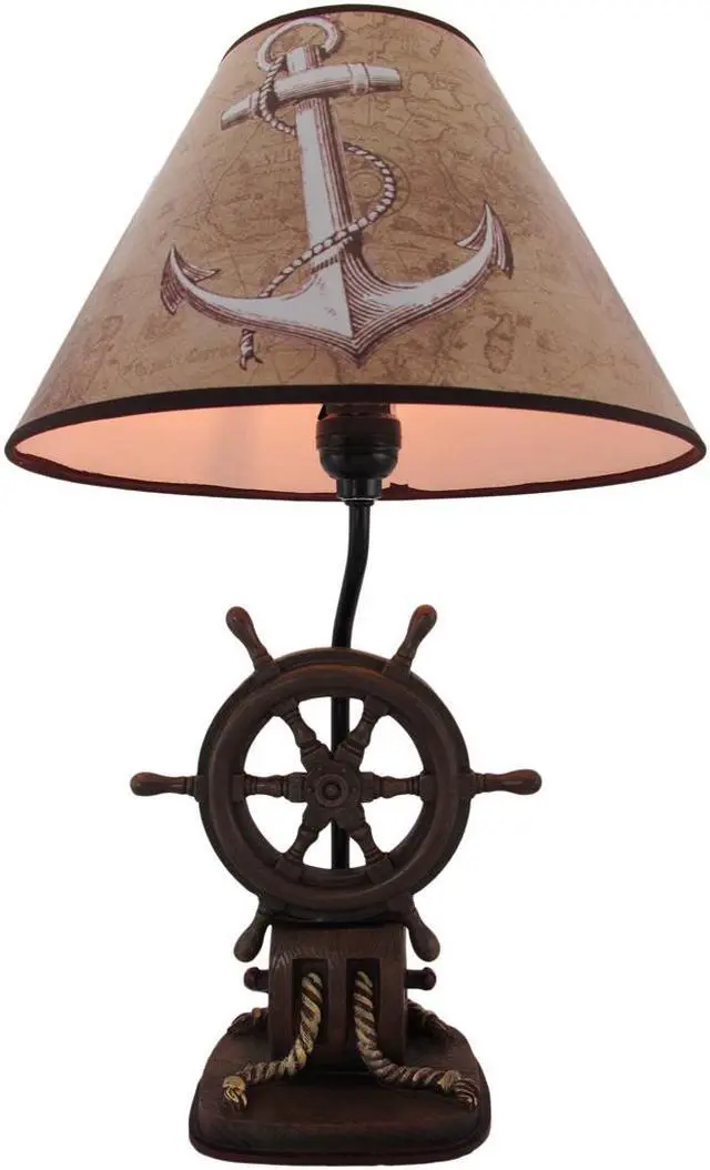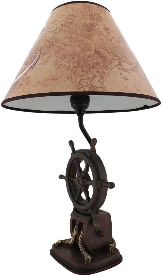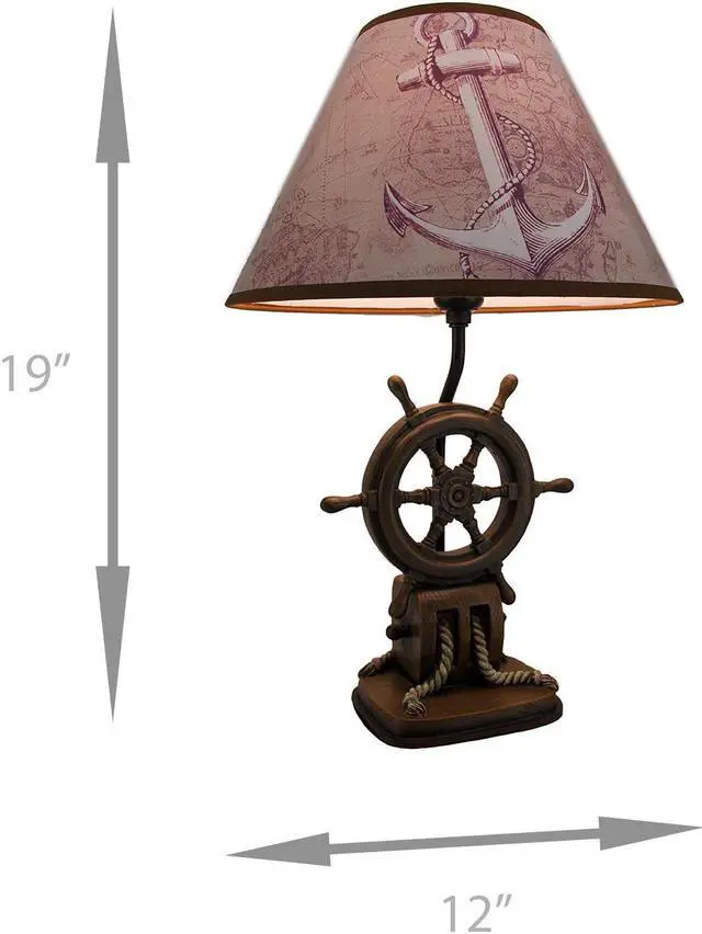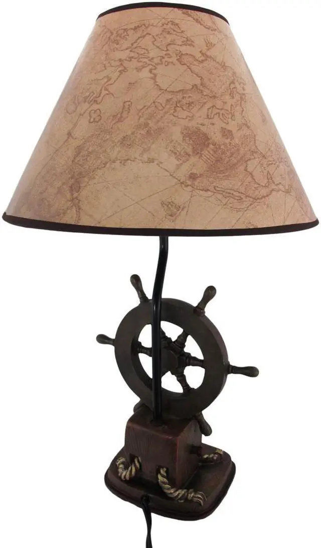 Enhance your coastal-themed living space with this exquisite Ship's Wheel Lamp, an ideal addition for rooms with a nautical or beach theme. Standing at 19 inches tall, this lamp features a meticulously crafted ship's wheel base, measuring 7 1/2 inches long by 4 1/2 inches wide, highlighting intricate detailing. The lamp is made from cold cast resin, ensuring durability, and is hand-painted with vibrant colors that bring the maritime theme to life. The lampshade is 7 1/4 inches tall, with a 12-inch diameter, showcases an anchor motif and an enchanting world map print, adding depth to its nautical allure.