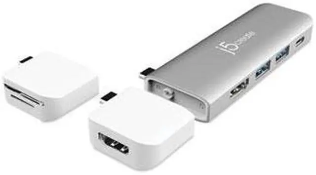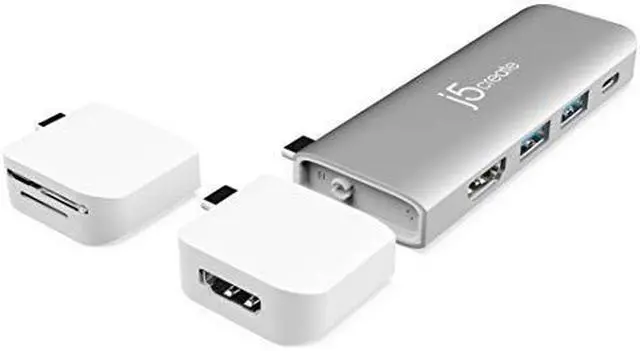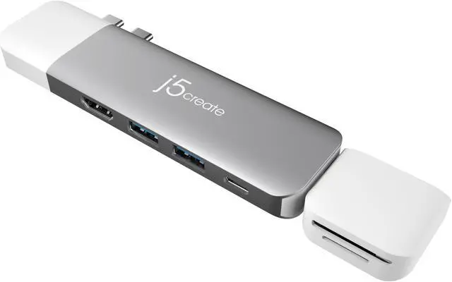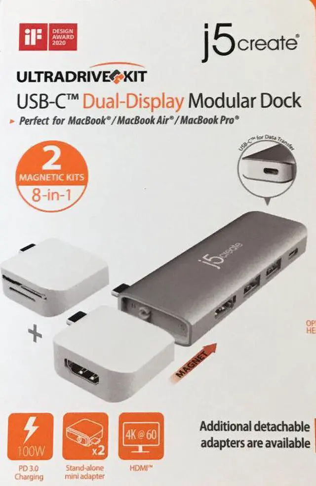 The j5create USB-C Dual-Display Modular Dock is a versatile mini docking station featuring two detachable magnetic kits along with the main body to give you flexible configurations for video, data storage and charging. The two detachable magnetic kits are stand-alone mini adapters that allow you to add additional functions. Each module can work separately as a stand-alone mini adapter or be magnetically attached for use together with the main body. This compact modular dock provides you with all the connections you need to get more done with dual-monitor support and two USB 3.0 Type-A peripherals. Free yourself from your home office and take your work on the go with this magnetic dock! UltraDrive Minidock can be used with the MacBook Pro 13", 15" 2016, 2017, 2018, 2019 and MacBook Air 2018, 2019; Acer Swift 5; Lenovo ThinkPad A485, A285; Surface Pro 7 and Surface Go. For Use With: Laptops; Connector/Port/Interface: HDMI; USB-C Thunderbolt 3; USB-C 3.1 Gen 1; (2) USB 3.1 Gen 1 Type-A; SD; microSD slot; (2) Thunderbolt 3 USB-C Male Connector; Batteries Required: No; Batteries Included: No.
