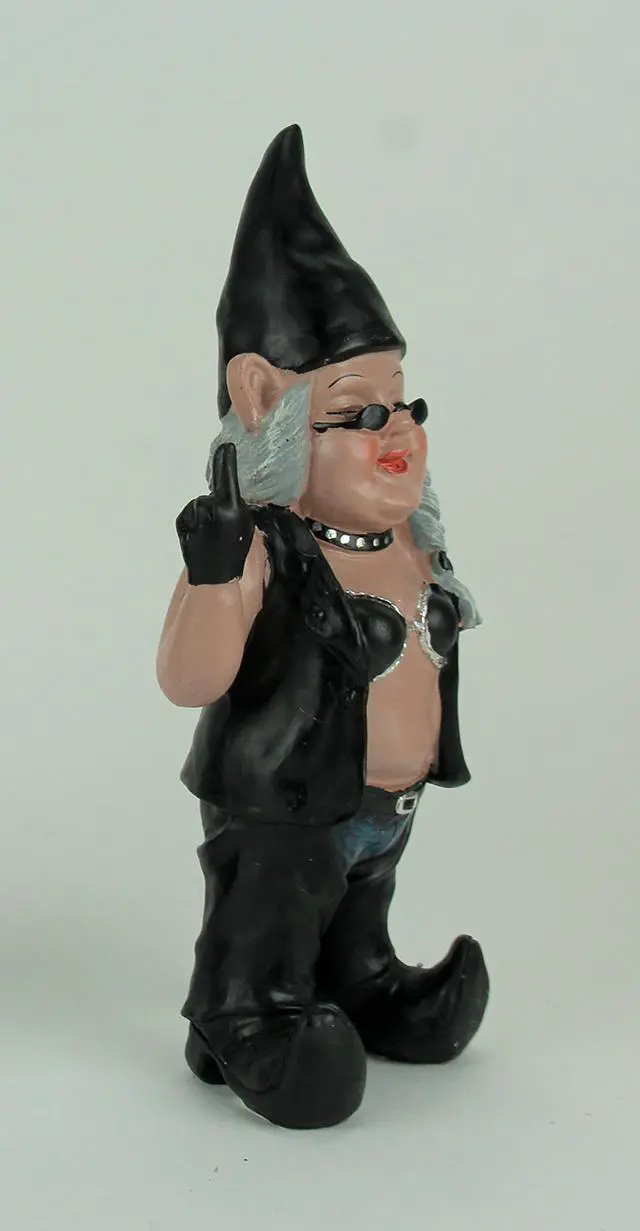 Meet Gnofun, the rebellious gnome who's traded her gardening gloves for a biker's edge! Tired of the ordinary gnome life, Gnofun is now all about leather-clad, badazz fun. Sporting a studded choker, a silver-trimmed halter top, a leather vest, chaps, jeans, and curved-toed boots, she exudes attitude. Standing at 12.5 x 5.5 x 3.5 inches, Gnofun is crafted from weather-resistant resin in an exclusive design. This daring gnome defies conventions, making a bold statement in any garden or yard. Her naughty finger gesture adds a touch of cheeky charm, making her a standout decorative piece for outdoor spaces.