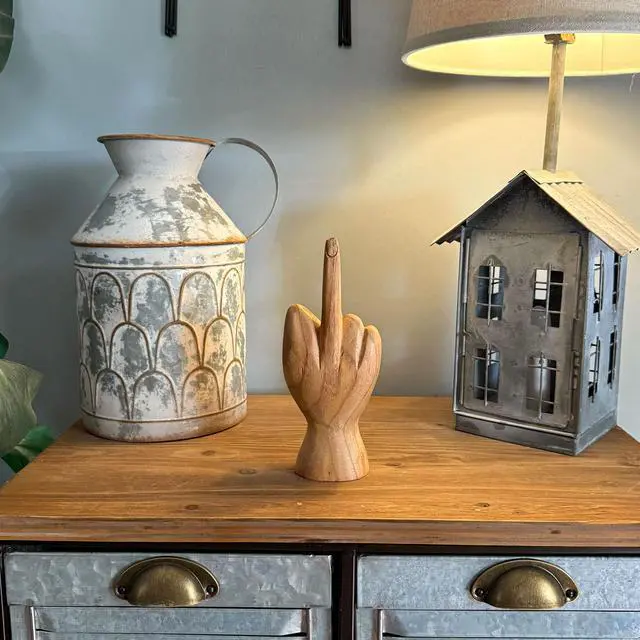 Beyond its decorative appeal, this statue stands as a symbol of self-expression, encouraging you to embrace your individuality. The "bug off" gesture, portrayed with finesse in this wooden sculpture, transforms ordinary decor into an extraordinary statement. Its small yet impactful presence makes it versatile, not only as a decorative sculpture but also as an unconventional centerpiece for your dining table. Its striking aesthetic prompts curiosity, sparking engaging conversations among guests and admirers. This hand-carved masterpiece carries more than just visual appeal; it embodies a spirit of independence and authenticity.