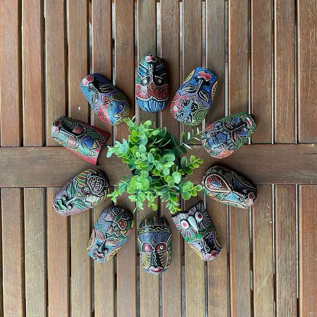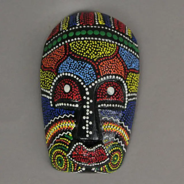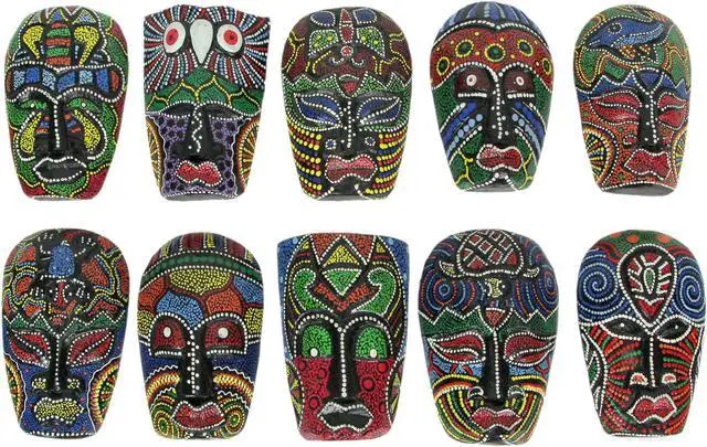 Transform your space with this set of ten 5-inch tall Aboriginal dot-painted tribal wall masks. Crafted by skilled artisans in Indonesia from lightweight Albesia wood, these masks bring vibrant hues and intricate detailing to your decor. Each mask, measuring approximately 5 inches tall, 3 inches wide, and 1.25 inches deep, is hand-carved and hand-painted, showcasing the artistry of the creators. Made from easily replenished Albesia wood, these decorative masks are eco-friendly and sustainable. The dark brown base is adorned with meticulous dots of brightly colored paint, giving each mask its unique personality.