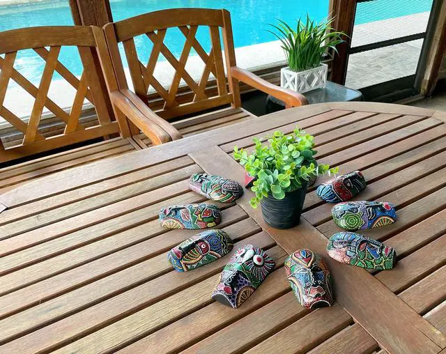 The masks, varying in size, shape, and color, offer a captivating blend of African and tribal aesthetics. Their versatility allows them to enhance any room, adding a splash of color and cultural richness. Display them indoors as unique wall decor, or outdoors to infuse your garden or patio with artistic flair. These masks, embodying the essence of tribal art, bring an exotic touch to your home. Please note that due to their handmade nature, each mask may exhibit slight variations in colors and patterns, making your collection truly one-of-a-kind.