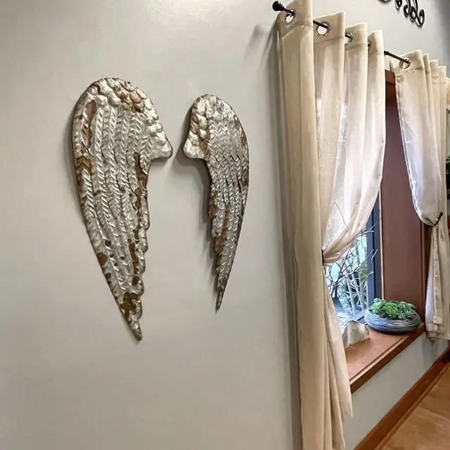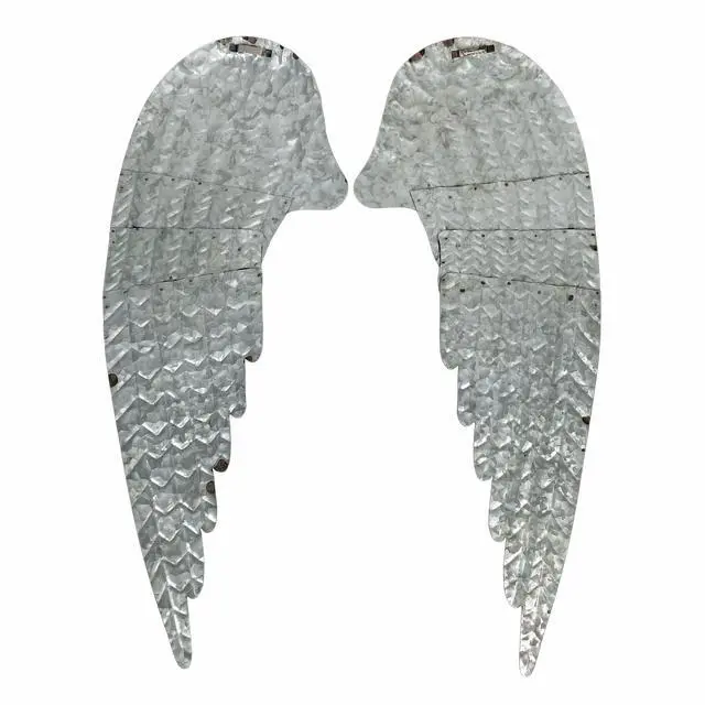 Made from durable metal, these wings strike a perfect balance between rustic allure and timeless grace. Their distressed appearance tells a story of ageless elegance, making them a unique focal point in any room. The galvanized finish infuses a touch of shabby chic charm, while the angelic symbolism adds depth and meaning to your space. Ideal for both indoor and outdoor settings, these wings inspire a sense of heavenly serenity. Whether you're decorating a cozy living room or enhancing your garden paradise, these angel wings are the epitome of artistic grace.