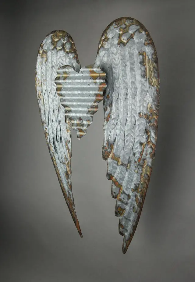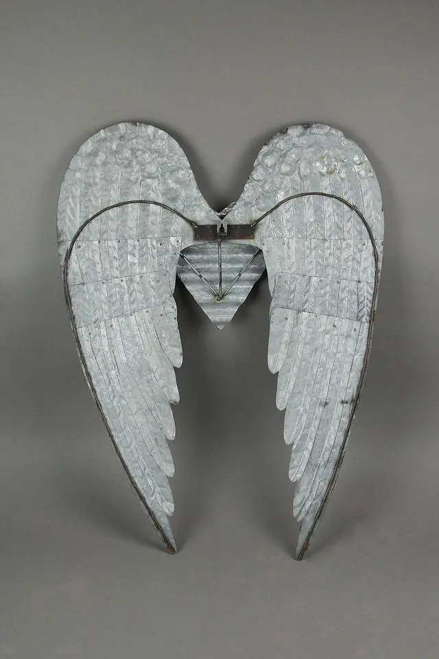 Elevate your home's ambiance with this captivating heart and wings sculpture, perfect for indoor and outdoor display. Crafted from durable metal, its intricate design mimics feathers, providing a unique texture. The galvanized finish, artfully aged on the edges, infuses an antique charm, blending seamlessly with diverse decor styles from rustic to contemporary. Measuring 27.5 inches in height, 22.5 inches in length, and 2.5 inches in width, this sculpture serves as a heartwarming focal point. Hang it indoors for a soulful touch, or adorn your garden fence or exterior wall for a whimsical outdoor display.