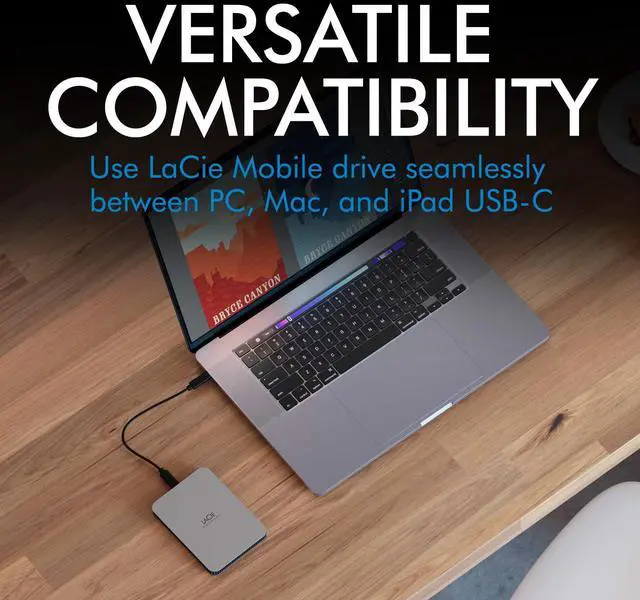 Simply plug in and you're ready to store, transfer, or backup your files. With a storage capacity of up to 5TB, it offers ample space for your photos, music, documents, and more, making it an ideal companion for digital enthusiasts. The LaCie Mobile Drive is more than just a storage device. It's a tool to help you manage your digital life. With the LaCie Toolkit software, you can easily set up one-click or automatic backups, and even mirror folders across multiple devices. This means you can store up to 500k high-resolution photos or up to 165 hours of videos, ensuring your precious memories and important documents are always safe and accessible.