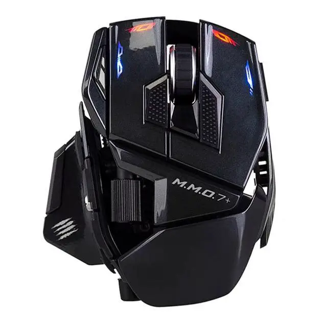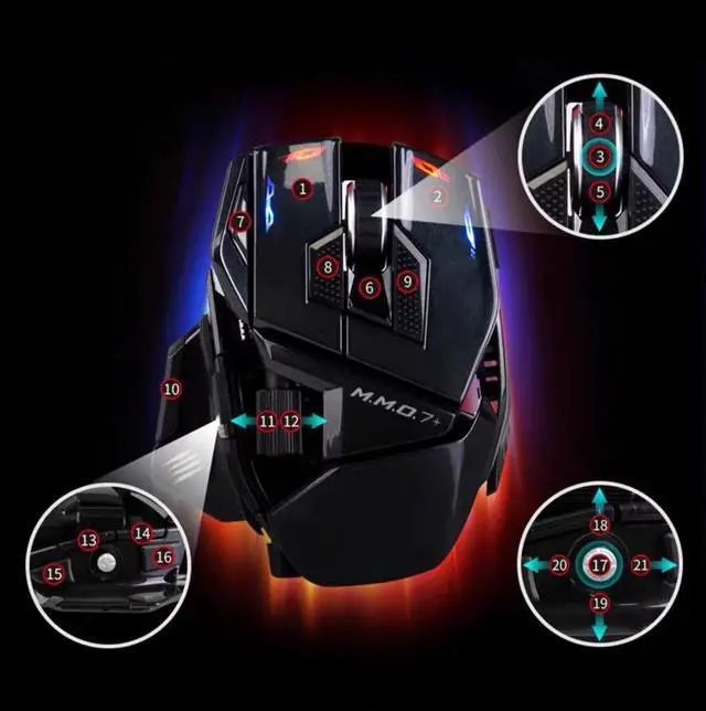 The M.M.O. 7+ features 21 programmable inputs and a unique 5D button, delivering an intuitive and precise control experience for gamers. A dedicated Shift Mode key instantly doubles available inputs (21 × 2), while five onboard profiles store multiple settings for quick in-game switching. Like the original M.M.O. 7, it features a replaceable palm rest adjustable to four positions. The thumb rest can be moved horizontally and front-to-back using the included adjustment tool, delivering true ergonomic support for nearly all hand sizes. The PixArt 3395 optical sensor delivers precise tracking up to 26,000 DPI, while the left and right buttons, featuring Kailh mechanical microswitches, boast an 80-million-click lifespan for exceptional durability and crisp tactile feedback. Dedicated software supports powerful macro editing, key mapping, RGB lighting customization, and more.