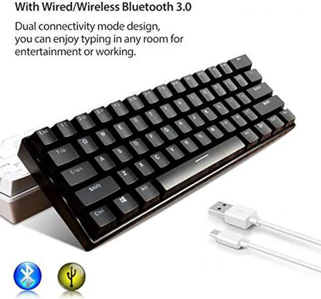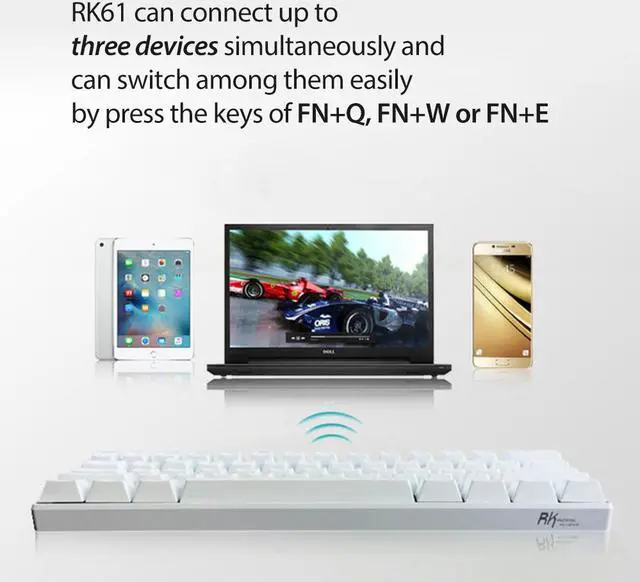 Multi-device and dual connectivity: RK61 is an universal mechanical keyboard with 61 keys for typing on all your Bluetooth-enabled computers or mobile devices that support external keyboards with HID profile, such as laptop, computer, tablet, smartphone. RK 61 is also with USB connectivity. Besides, RK61 can connect up to three devices simultaneously and can switch among them easily by clicking the button of FN+Q, FN+W or FN+E.