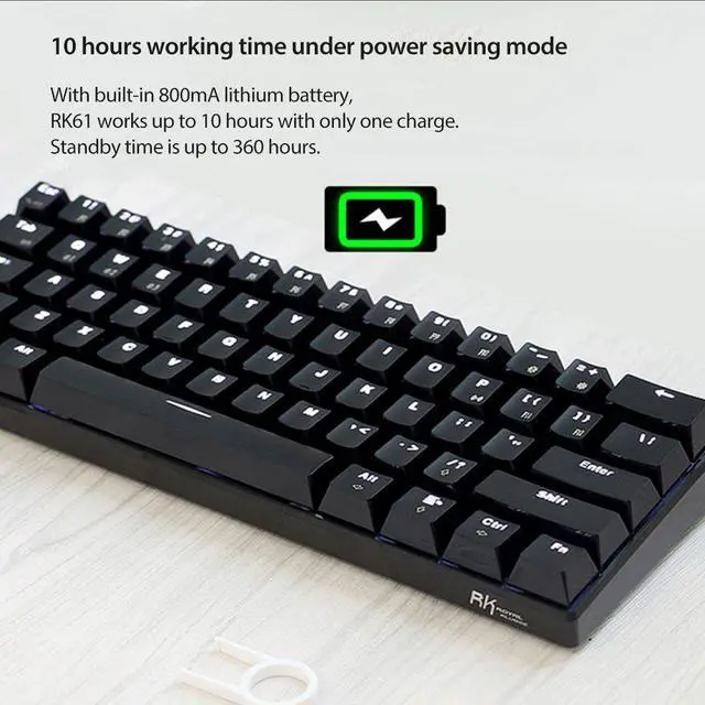 Built-in rechargeable battery: Users get pleasure from up to 10 hours of writing time with only one charge. RK61 bluetooth keyboard has a rechargeable lithium-ion battery. Standby time is up to 360 hours. If it is power off, you can change into USB mode. 5.