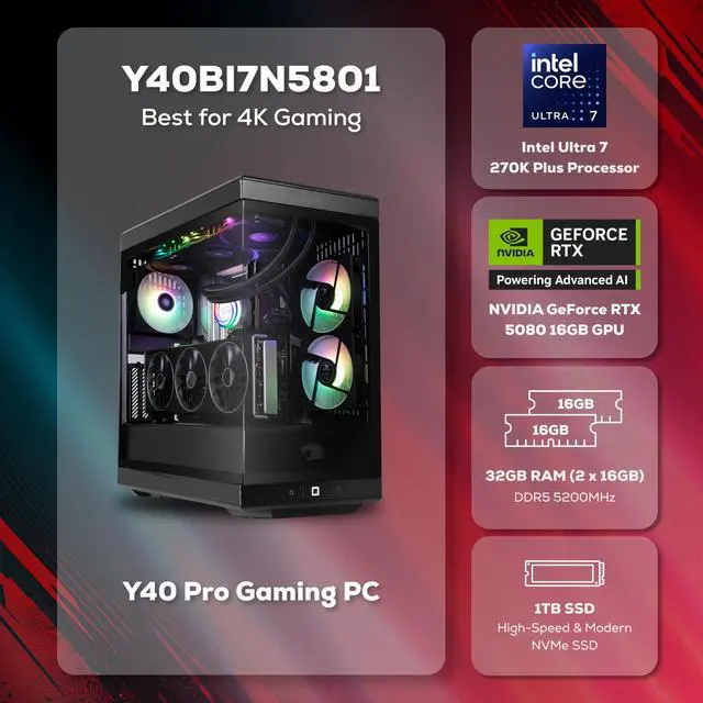 Level up your setup with the iBUYPOWER Y40BI7N5801, the perfect gaming PC build for someone looking to upgrade their desktop computer system for video games, editing, and streaming. This prebuilt iBUYPOWER Gaming PC utilizes professionally vetted components to create a high-performing desktop machine. Take gaming and content creation to a new level on an Intel Core Ultra 7 270K Plus processor, with a NVIDIA GeForce RTX 5080 16GB graphics card. Enjoy fast load times and ample storage space on a 1TB NVMe solid-state drive. Multitask like no other thanks to 32GB DDR5 RAM.