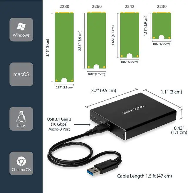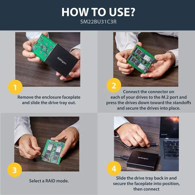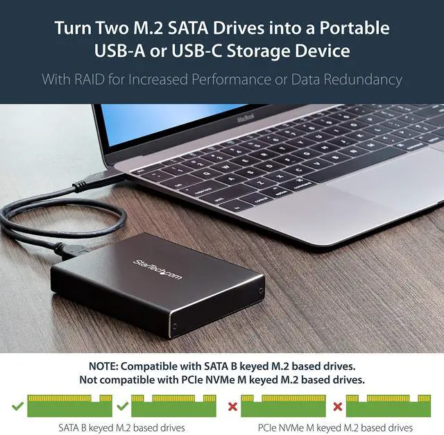 The M.2 SATA RAID enclosure is powered directly from the USB port on your device, so no external power is required. It comes with two USB cables (USB-C to Micro-B and USB-A to Micro-B) for flexible use with the latest laptops and tablets equipped with a USB-Type C™portas well as legacy devices.The enclosure is OS independent, with no additional software or driver installation required, and is compatiIts also compatible with a Thunderbolt™ 3 USB-C port.