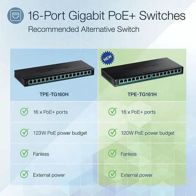 PoE+Features a 120W total PoE power budget, and supplies 16 Power over Ethernet devices with up to 30W per port Gigabit Ports With high-speed gigabit ports and a full switching capacity, these switches are well-suited for the most demanding network applications. Fanless PoE+ switch design lowers unnecessary energy consumption and eliminates disruptive operating noise. NDAA / TAA compliant (U. S. and Canada only)