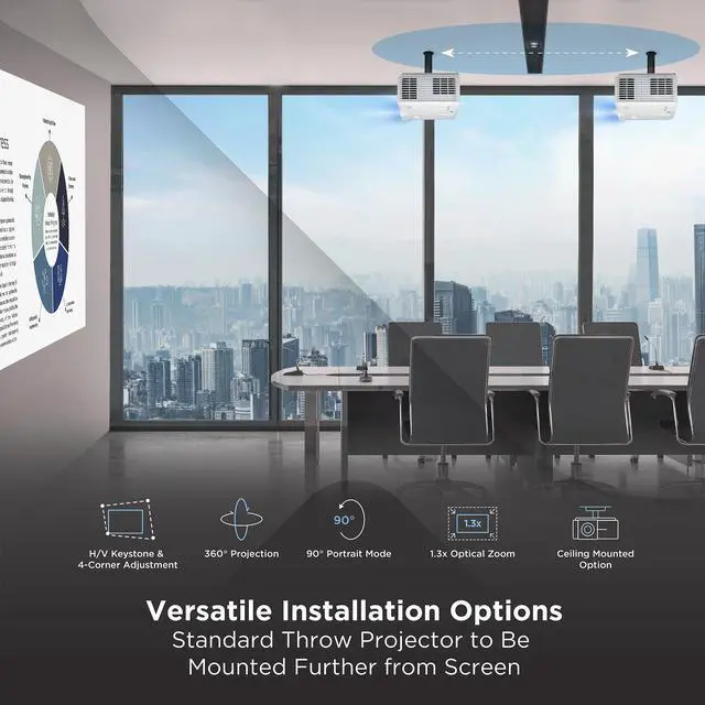 The LS740W laser projector comes loaded with features like 1.3 x optical zoom, H/V keystone, 4 corner adjustment, 360° projection and portrait mode for easy setup and versatile applications.