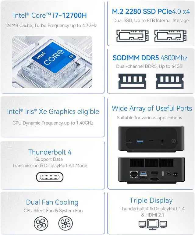 Beelink Mini PC SEi12 MAX, Intel Core i7-12700H(up to 4.7GHz), RAM-32GB SSD-500GB, DDR5 4800MHz, WiFi6 Bluetooth5.2, Mini PC Gaming Office Home, DP HDMI PC Black