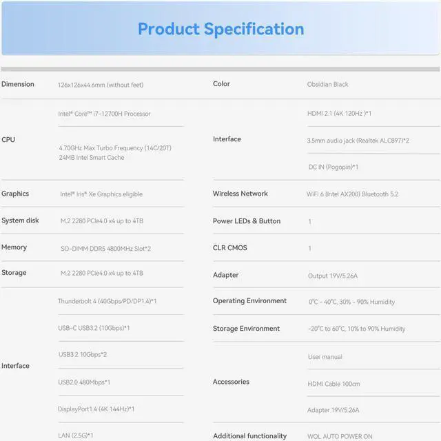 • CPU:Intel Core i7-12700H Processor,4.70GHz Max Turbo Frequency(14C/20T),24MB Intel Smart Cache