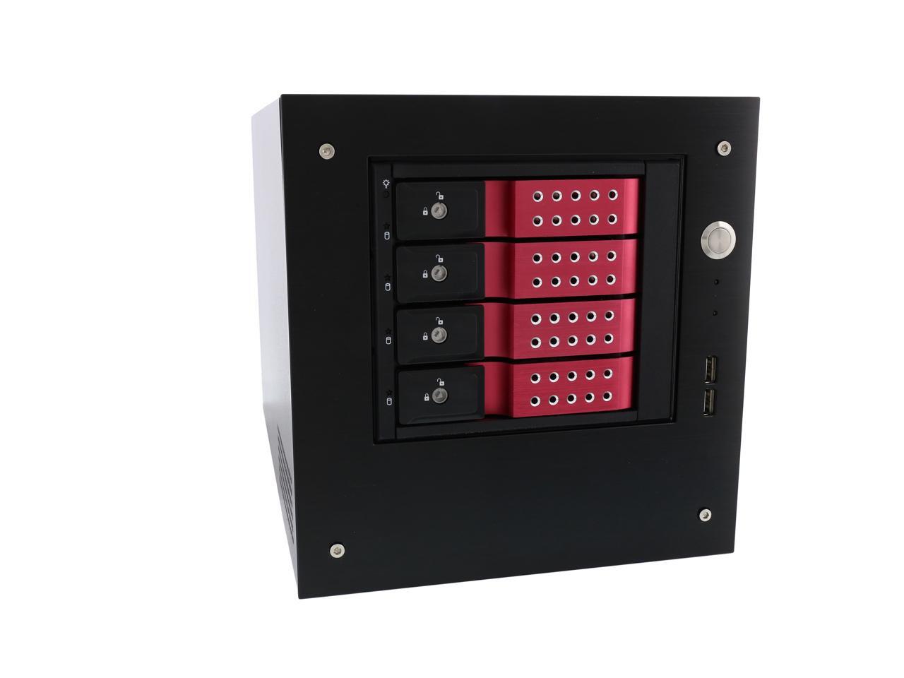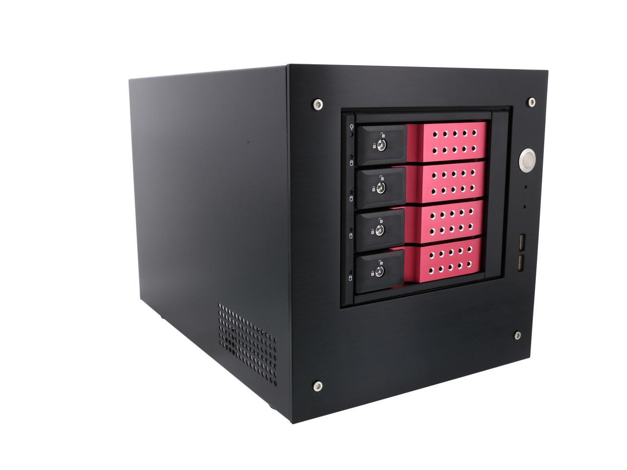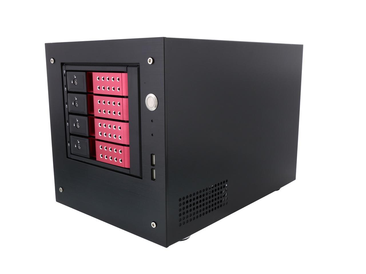 | Features | Red HDD Handle Sleek Front Panel with Power On Button 4x 3.5" Trayless Hotswap Bays 4mm Aluminum Front Panel Support 6.0Gb/s SATA/SAS HDDs First PVC Laminate Technical in NAS Chassis Compatible with Flex Power Supply Heavy Duty SECC Construction Support Standard I/O Slot Support mini-ITX Motherboard |