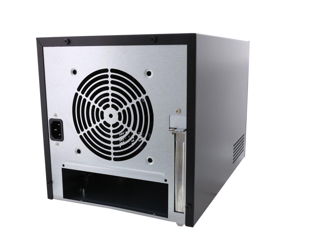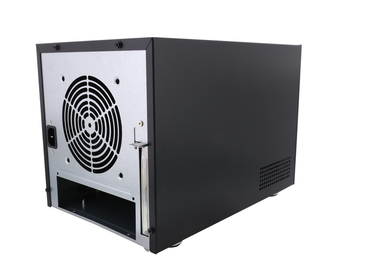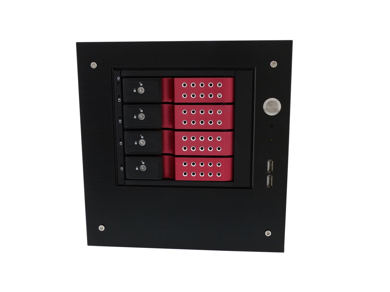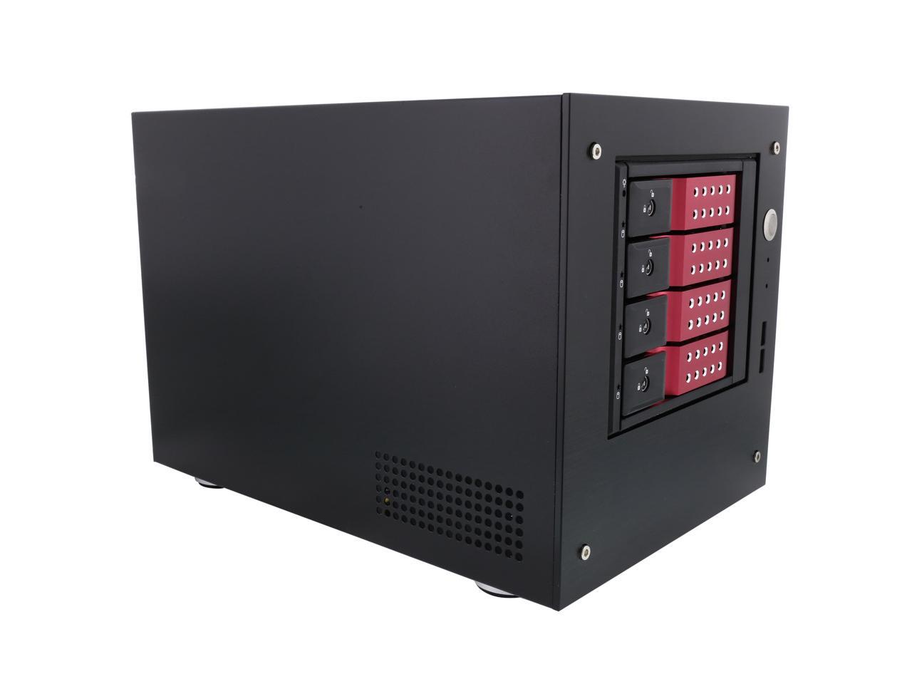| Features | Red HDD Handle Sleek Front Panel with Power On Button 4x 3.5" Trayless Hotswap Bays 4mm Aluminum Front Panel Support 6.0Gb/s SATA/SAS HDDs First PVC Laminate Technical in NAS Chassis Compatible with Flex Power Supply Heavy Duty SECC Construction Support Standard I/O Slot Support mini-ITX Motherboard |