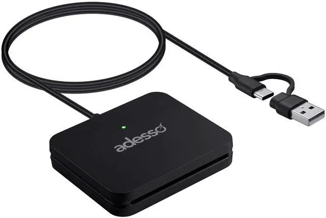The Adesso SCR-400 is a USB-C desktop smart card reader built for military service members, government employees, federal contractors, healthcare professionals, and anyone who needs reliable contact smart card authentication at their workstation. It reads CAC (Common Access Card), PIV, national ID, and banking chip cards, giving users direct access to platforms such as ActivClient, AKO, OWA, Marinenet, AF Portal, DTS, LPS, Pure Edge Viewer, ApproveIt, and Disa Enterprise Email. The reader features a USB-C interface with a tethered USB-A adapter so it works with both current and legacy computers without requiring a separate cable or hub.