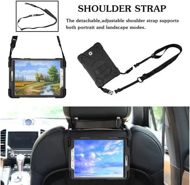 Compatibility: This product has a series of models with different colors for tablet but only for Samsung Galaxy Tab S2 9.7 inch T810/T813/T815, NOT fit other models. Please confirm the product before purchase. Unique multifunction three layers rugged protection design case with kickstand + a hand strap + a shoulder strap. not built-in-screen protector the tablet remains original touch feeling 360 degrees rotatable kickstand & The adjustable hand strap mechanism for better experience with your tablet. Ideal for kids, students, teachers or anyone else who needs it for presentations, conferences and travelling. Adjustable removable shoulder straps. Attach strap to any two holes to carry your device vertically or horizontally like a messenger bag / neck bag / sling / harness or holster. allows you to display your tablet behind one seat for personal viewing or between two seats for shared viewing