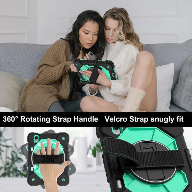 Built-in 360 Rotatable Kickstand + Hand Strap : 360-degree rotating swivel stand supports position of 3 angles(Vertical, Horizontal, and Halfway between), ideal for watching videos, conferences and travelling. Soft rotating handle strap prevents falling of tablet, featuring convenient use for school teachers, students, waiters, doctors, nurses and conference presenters.