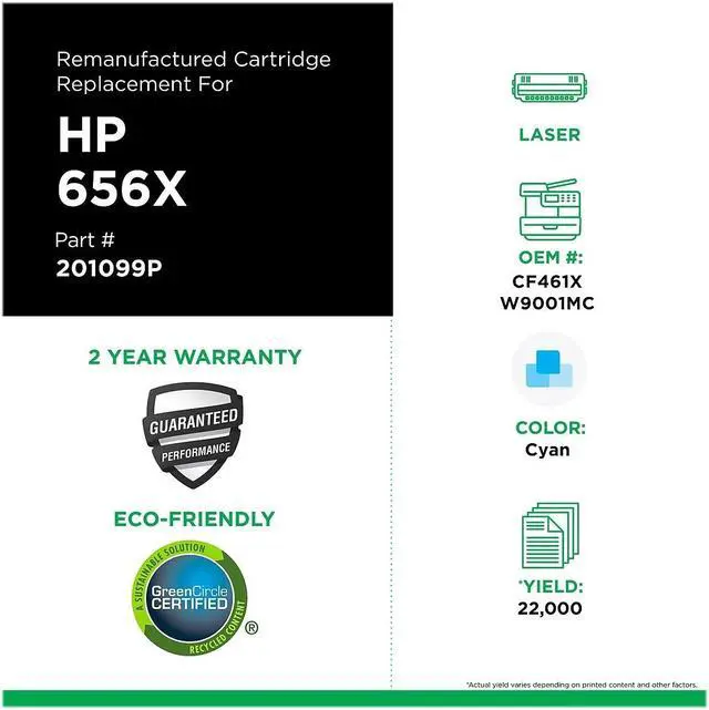 With a business model centered around sustainable innovation, this Clover Imaging Group environmentally friendly remanufactured cartridge replacement for HP 656X allows lowering printing costs while reducing environmental impact. This laser cartridge is developed using state-of-the-art, high-quality toner that performs as well as, or better than, original equipment manufacturer (OEM) cartridges. Environmentally sustainable, the cartridge is remanufactured using 86% recycled content and is designed to keep the cartridge out of landfills and money in your pocket. If you're looking for a high-quality product with a 100% performance guarantee, this is the solution for you.
