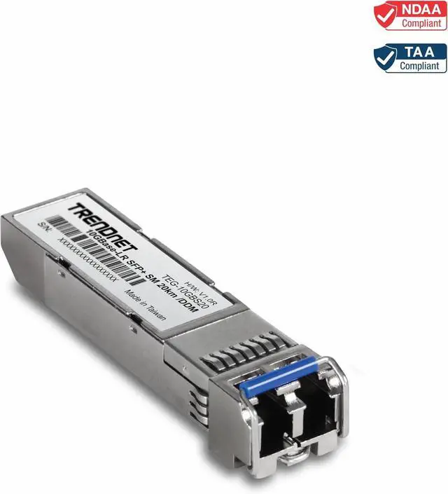 TRENDnet’s SFP+ Single Mode LC Modules are compatible with standard SFP+ slots found on network switches and fiber converters. Each single mode 10G SFP+ transceiver is equipped with a duplex LC fiber connection interface and supports highspeed data rates up to 10.31Gbps. All TRENDnet 10G SFP+ fiber modules support connections for reliable, long- distance network applications.