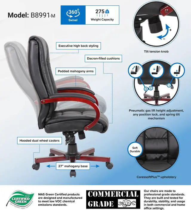 Beautifully upholstered with soft, durable and breathable CaressoftPlus™ upholstery. Dacron filled top cushions with perforated centers. Mahogany finished wood. Heavy duty 2 paddle spring tilt mechanism with infinite tilt lock. Pneumatic gas lift seat height adjustment. Adjustable tension control. Hooded double wheel casters.