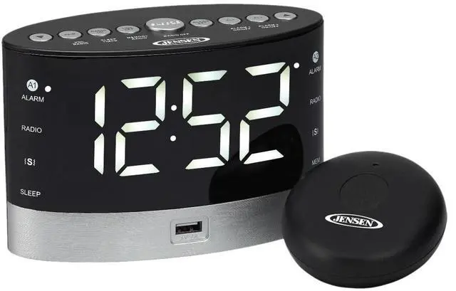 ­The JENSEN® JCR-255 AM / FM Digital Dual Alarm Clock Radio with Under Pillow Vibrator will wake even the soundest of sleepers, as well as those who are hearing impaired. The wireless vibrating remote has 3 levels of intensity and will operate up to 33 feet from the JCR-255 - wake to vibration from under your pillow, the radio or to an alarm. You can also charge your smartphone while you sleep with the built-in 2 amp front mounted USB port. This clever unit also includes an easy to read 1.8" white LED display with rotating dimmer control, dual alarms, and AM / FM receiver with 10 AM and 10 FM presets. It operates on 120V AC power, and has a battery back-up feature for saving your time settings in the event of a power outage.< / p>