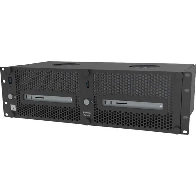 This rackmount solution is ideal for use in server rooms, thanks to its standard 3U height and standard mounting holes. The front panel operation includes dedicated power buttons for each Mac Studio computer, passthrough USB-A ports for connecting USB devices, and easy access to the computers' front ports and SD card slots. The RackMac Studio Pro 3U Rackmount Enclosure also features a unique storage space for Thunderbolt or USB SSDs (sold separately). This space, located beneath each Mac Studio computer, is secured with two included adhesive-backed magnets. Designed with portability in mind, the RackMac Studio Pro 3U Rackmount Enclosure has a 9.5 -inch mounting depth and firm rubber cushions to hold the Mac Studios securely in place during transport.