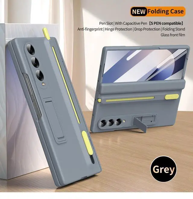 Compatible for Samsung Galaxy Z Fold 3 --- The case with kickstand and s pen holder is only compatible with Samsung Galaxy Z Fold 3 (2021) ONLY. Ideal 5 in 1 structure : Stylus pen + S pen holder + Hinge protector + Hidden kickstand + Screen protector, skin feel touch and shock proof case for galaxy fold 3 phone.( Reminder : The pen is not an official S-Pen! This is an ordinary capacitive stylus,the tip is rubber,The stylus pen can not be charged and not support bluetooth).