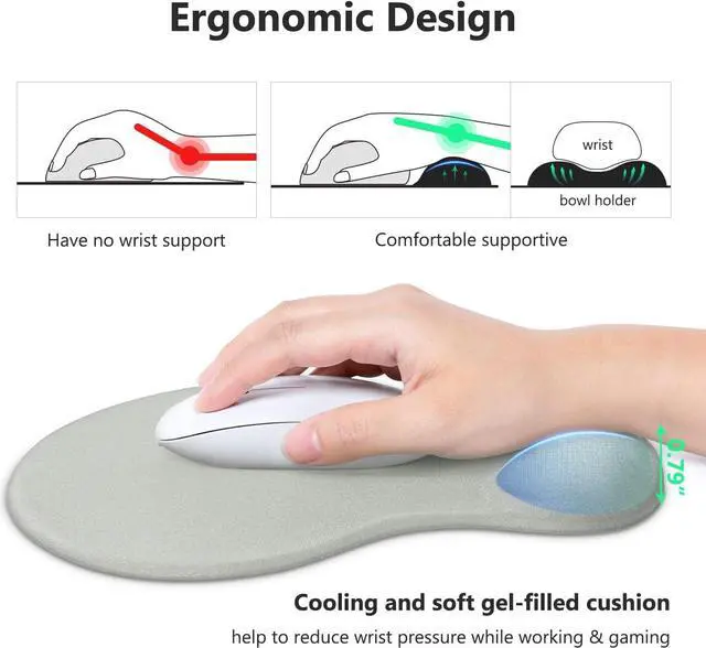 • Gel CushionFilled with excellent cooling gel. The soft and comfortable gel-filled cushion offers your wrist maximum comfort and support. Ergonomic Mouse Rest alleviates pressure on your wrist by elevating it on a comfortable angle for your long-term use of computer.^^