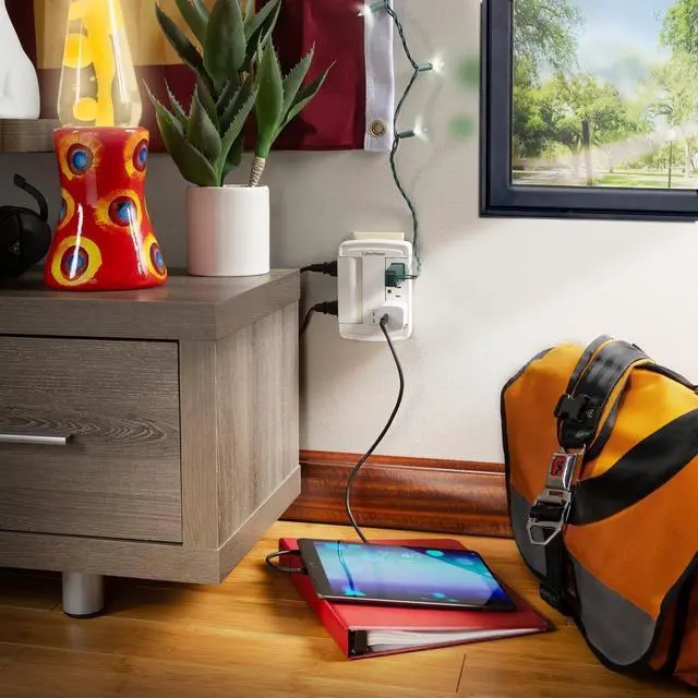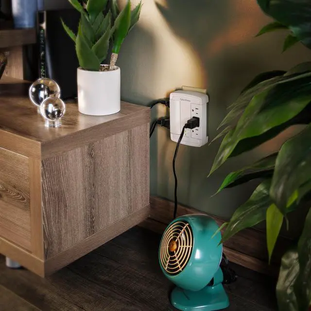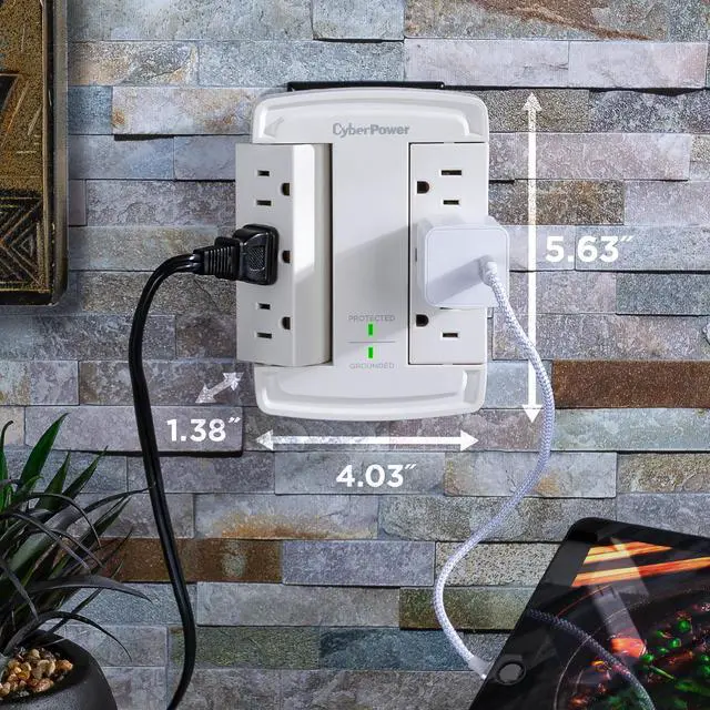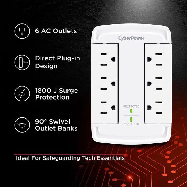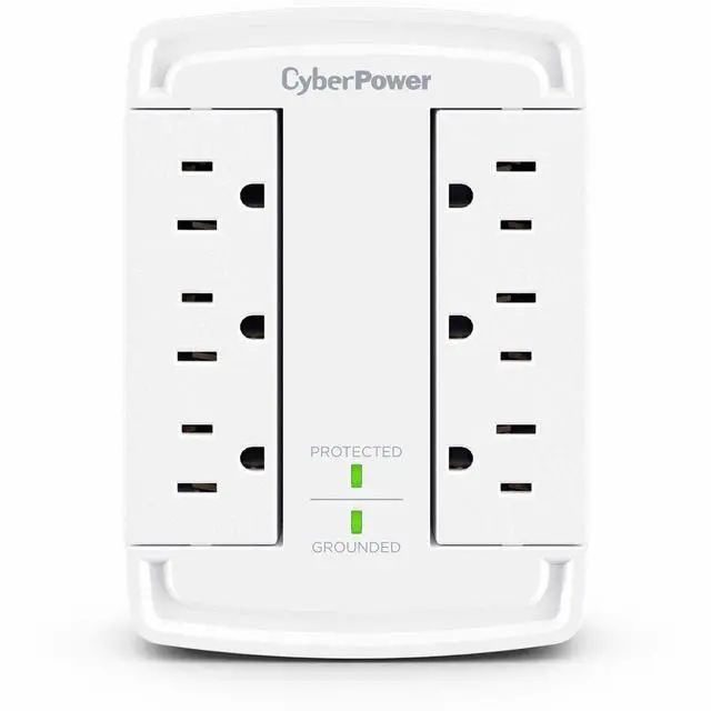 The CyberPower CSB6WS Surge Protector transforms a standard 2-outlet wall socket into six surge-protected outlets, giving you the space and safety your devices need. Perfect for crowded areas where chargers, computers, and electronics compete for limited plugs. Featuring dual swiveling outlet banks, this surge protector offers flexible positioning and improved cord management-keeping your setup neat and organized. With 1800 joules of surge protection, it defends your valuable tech from power spikes and electrical surges. Ideal for safeguarding computers, routers, modems, chargers, and other personal tech essentials.