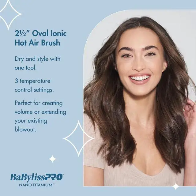 One step to volume and style with exceptional shine. The Oval Ionic Hot Air Brush allows you to dry and style, all with one tool. The combination of nylon and boar bristles helps detangle while providing the perfect amount of tension for any hair type. Achieve a salon-quality blowout at home anytime. Nano Titanium delivers highly efficient heat transfer and instantly smooth and shines Great for achieving a salon-quality blowout Create volume or extend your existing blowout with ease. Tangle-free combination bristles provide perfect tension for all hair types. 3 temperature control settings, Removable rear filter for easy cleaning, Professional 8 ft. power cord.