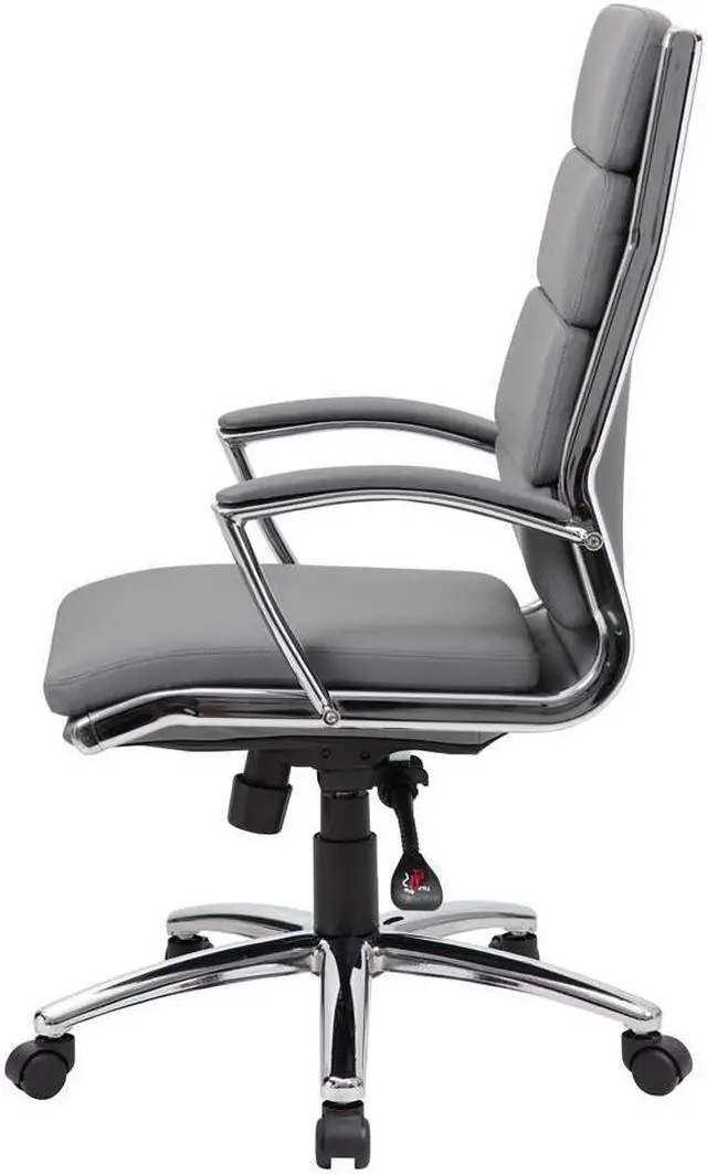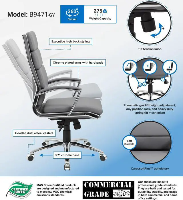 Upholstered with ultra soft, durable and breathable Gray cares soft plus upholstery. Metal chrome plated arms topped with hard arm pads. Heavy duty two paddle spring tilt mechanism with infinite lock. Upright locking position. Pneumatic gas lift seat height adjustment. Adjustable tilt tension control. Large 27 in. chrome base for greater stability. Hooded double wheel casters. MAS certified green.