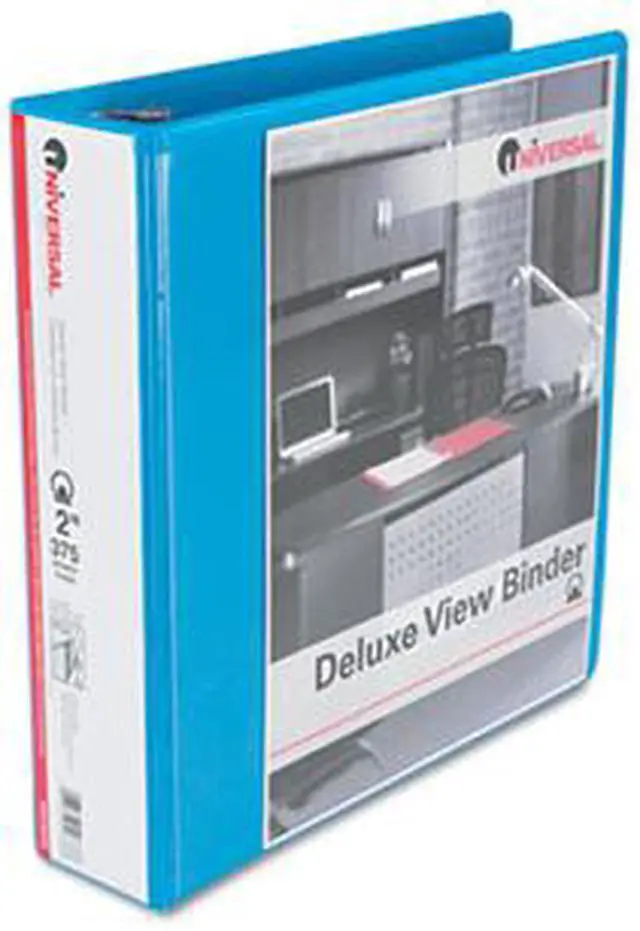 Create the perfect title page, then place it inside the see-through plastic overlay. Wide base rings lock in place to hold pages securely. Two inside pockets for additional storage of loose documents. Included card stock spines are easy to remove, reverse and re-use. Back mounted with exposed rivets on spine. Non-stick, heavy-duty cover, deep 3.5 inside clear pockets. Capacity Range [Max]: 2"; Sheet Capacity: 375; Color(s): Light Blue.
