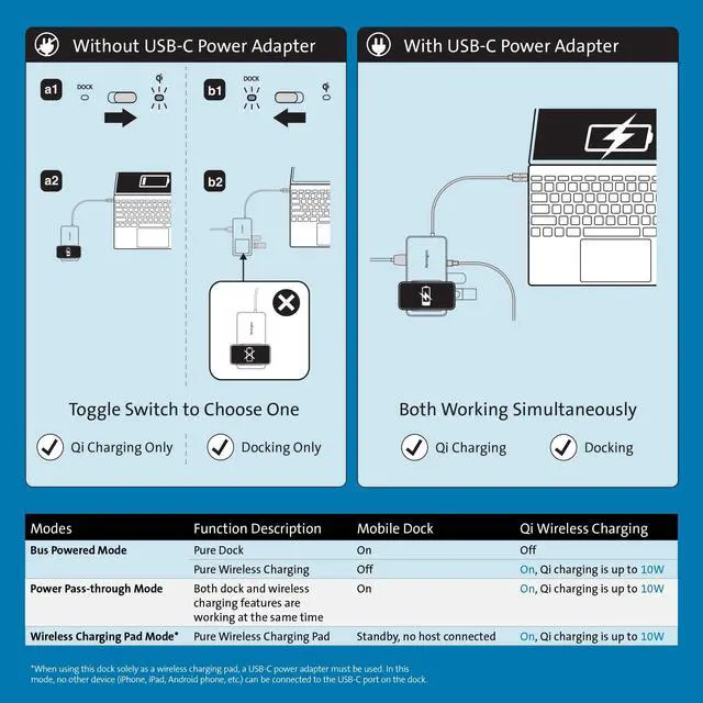 Supports up to 10W phone charging in power pass-through and bus-powered mode. When in bus-powered mode, simply toggle the switch to choose between Qi charging and docking functionality.