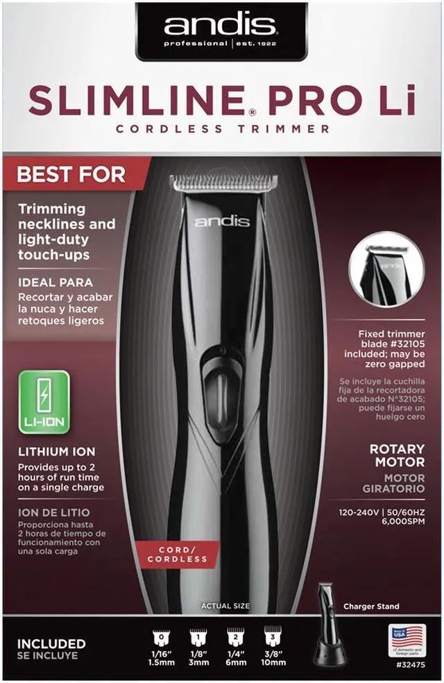 Andis Black Slimline Pro Li Cordless Trimmer - CL-32475 Andis SlimLine Pro Li T-Blade Cordless Trimmer is the perfect lightweight trimmer for all your needs. Balanced, ergonomic design for light-duty touch-ups and trimming around necklines.