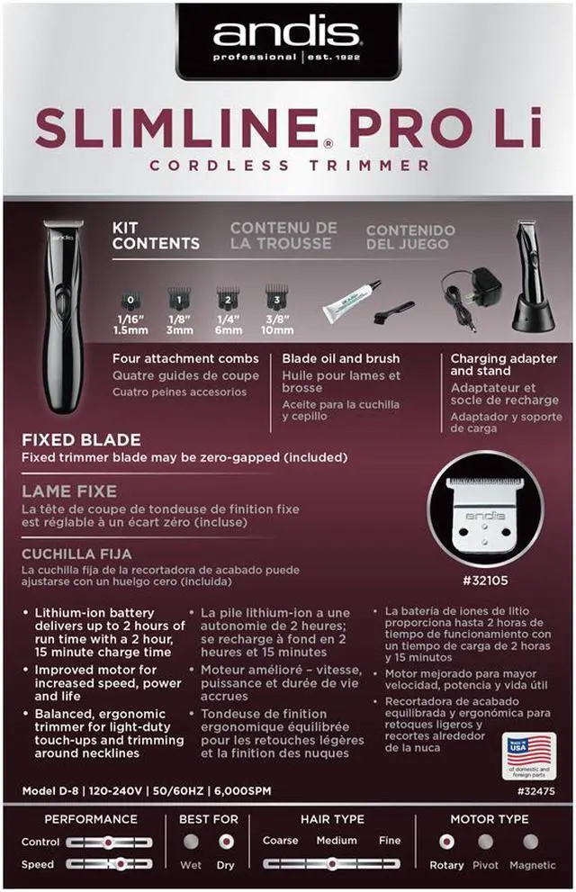 INCLUDES: Lightweight Rotary Motor Trimmer Improved Motor For Increase Speed, Power & Life For Trimming Necklines & Light-Duty Touch-Ups Fixed Trimmer Blade #32105 (May Be Zero-Gapped)Balanced, Ergonomic Design Provides Up To 2 Hours of Run Time on A Single Charge Compact Charger Stand Cord/ Cordless Operation For Great Flexibility FEATURES: 4