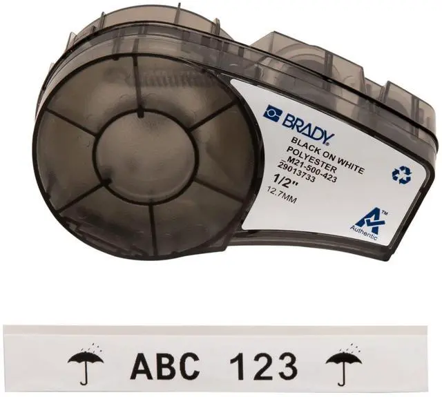 Brady Polyester Polyester Label Tape Cartridge, Black/White, 1/2"W x 21 ft.